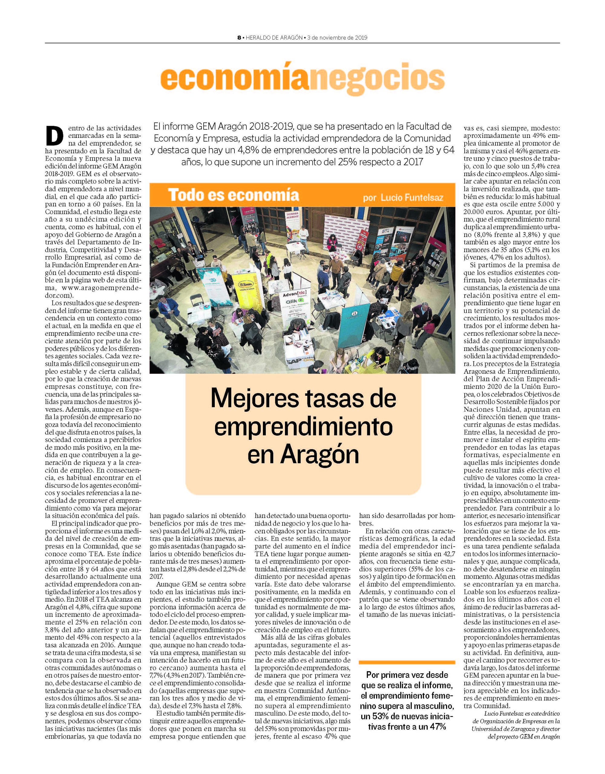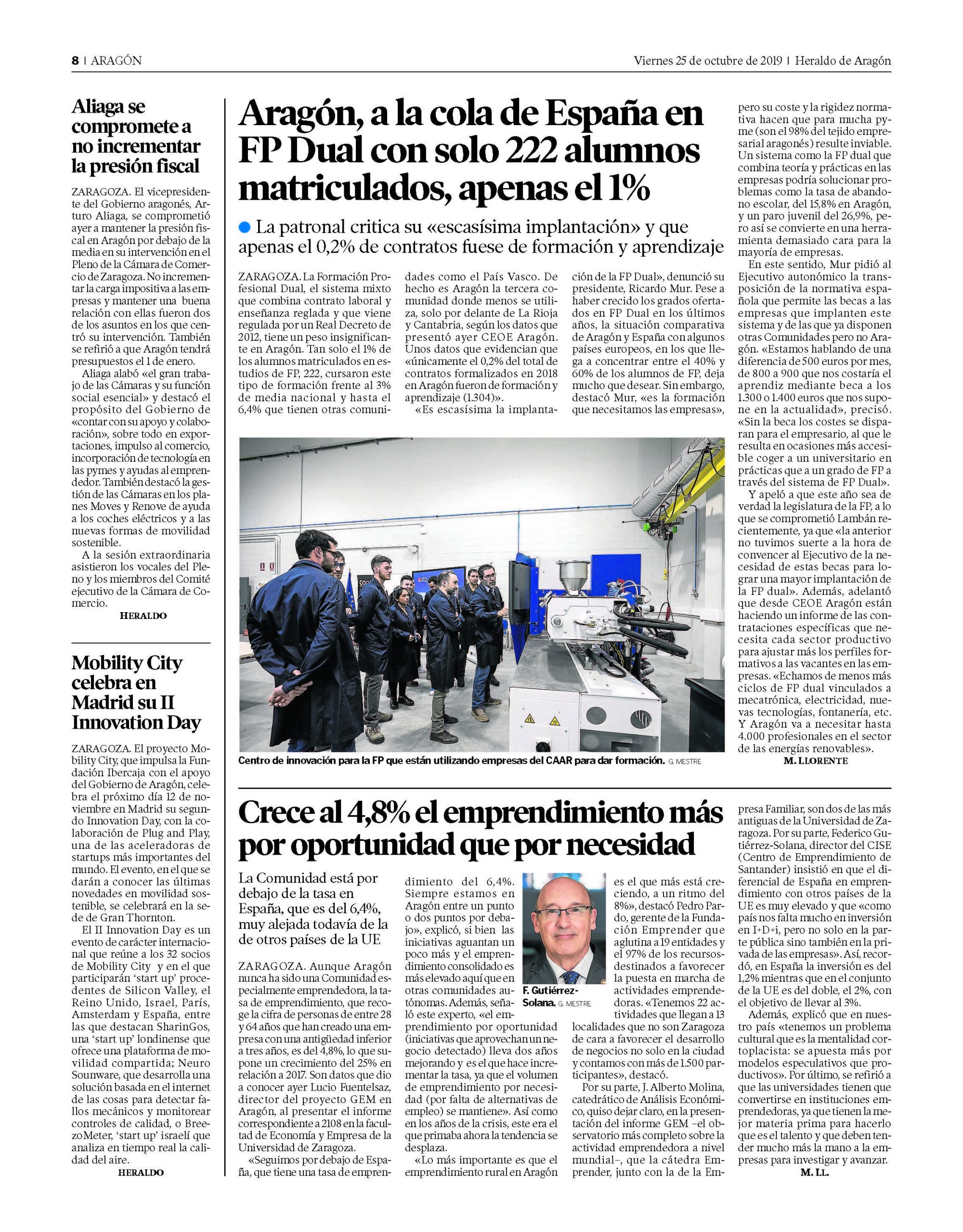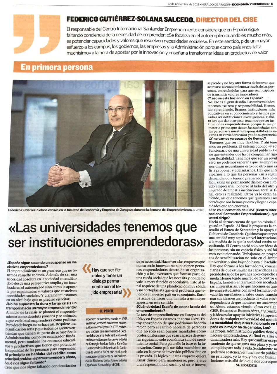 En primer lugar, el Director de la Cátedra Emprender y miembro del CdR Aragón explicó las motivaciones para organizar conjuntament este acto y detalló las actividades recientes de la Cátedra y del Club de Roma sobre Emprendimiento Global. Seguidamente, el Director del Informe GEM Aragón, Lucio Fuentelsalz, presentó el Informe correspondiente al año 2018 en el que destacó que la tasa de emprendimiento en Aragón se sitúa en el 4.8%, lo cual supone un incremento del 26% con respecto a la tasa del año anterior, aunque todavía queda por debajo de la tasa española que alcanza la cifra del 6.4% (incluir como link el adjunto). Seguidamente, el Director del Centro Internacional Santander Emprendimiento (CISE) y exPresidente de la Conferencia de Rectores de Universidades Españolas, D. Federico Gutiérrez Solana, impartió la conferencia magistral «El Emprendimiento como Estrategia de Desarrollo Global».